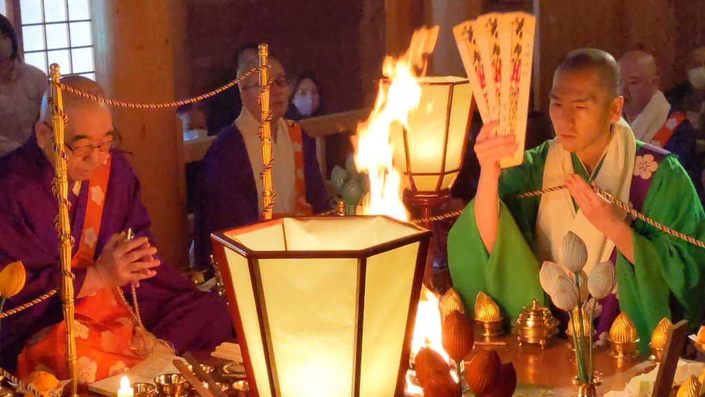 護摩とは、火を焚いて諸仏を供養し、煩悩を焼き尽くす真言密教の修法です。 当山では、毎月8日の縁日や大祭において護摩供を勤修し、皆様の願いを仏様にお届けしています。 炎が天に昇るように、皆様の願いも成就へ向かうよう祈念いたします。